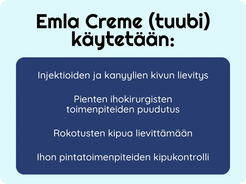- Sovellusalueet: Emla soveltuu ehjälle iholle; limakalvoilla ja vaurioituneella iholla imeytyminen voi kiihtyä – noudata tällöin terveydenhuollon ammattilaisen ohjeita.