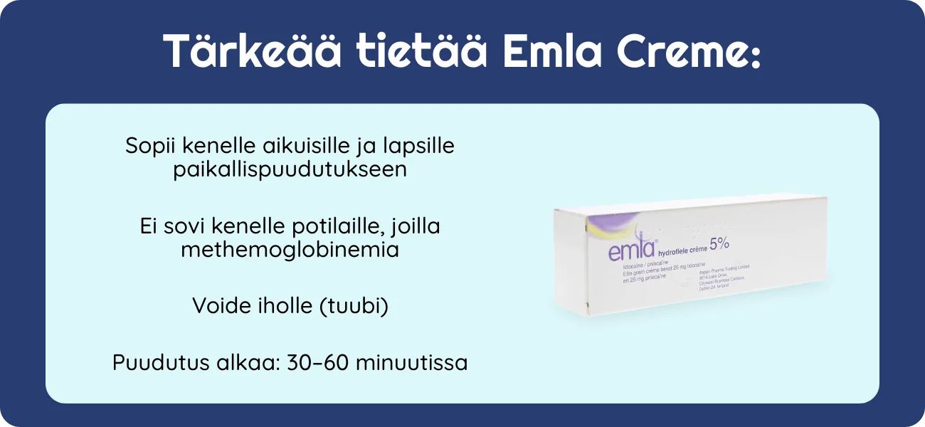 - Viesti hoitohenkilökunnalle: kerro Emlan käytöstä, jotta toimenpiteen tekijä osaa huomioida puudutuksen ja ihon mahdollisen kalpeuden.