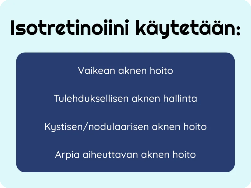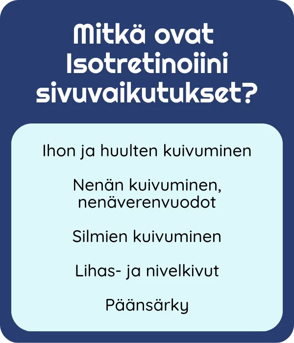- Haittavaikutukset: Yleisiä ovat kuiva iho, kuivat huulet ja kuivat/säröilevät silmät. Vakavampia, mutta harvinaisempia ovat maksavaikutukset, rasva-arvojen nousu sekä mahdolliset mielialaoireet. Kerro lääkärille kaikista oireista.