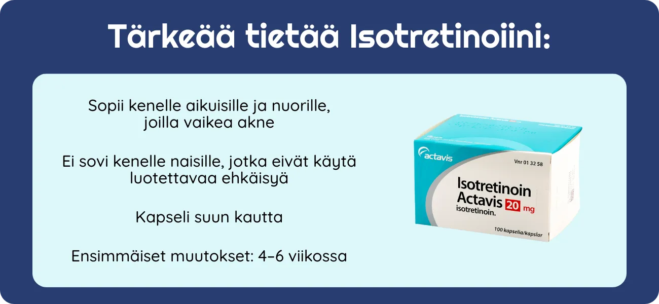 Muista: käytä isotretinoiinia vain lääkärin valvonnassa, noudata annostusta ja lue pakkausseloste huolellisesti. Hedelmällisessä iässä oleva nainen ei saa käyttää lääkettä ilman tehokasta ehkäisyä.