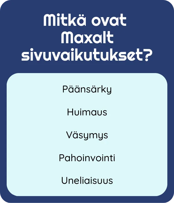 Maxalt (ritsatriptaani) on triptaanivalmiste, joka tarjoaa monille migreenipotilaille nopean ja tehokkaan keinon katkaista akuutti kohtaus. Oikea annos, riittävän varhainen otto ja yhteisvaikutusten huomiointi parantavat onnistumisen todennäköisyyttä. Jos kohtauksia on tiheästi tai akuuttihoito ei riitä, kysy lääkäriltä ennaltaehkäisevän hoidon mahdollisuuksista. Käytä Maxaltia aina lääkärin ohjeen mukaan, äläkä ylitä enimmäisannosta.