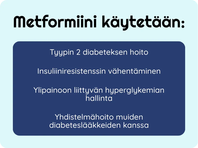 Metformiini on tarkoitettu aikuisille ja 10 vuotta täyttäneille lapsille, joilla on tyypin 2 diabetes. Sitä käytetään, kun ruokavalio- ja liikuntamuutokset eivät yksin riitä. Metformiini on hyödyllinen erityisesti ylipainoisille potilaille, sillä se voi pienentää diabetekseen liittyvien komplikaatioiden riskiä. Joillakin käyttäjillä havaitaan noin 2–3 %:n painonlasku osana kokonaisvaltaista hoitoa (tätä ei kuitenkaan määrätä pelkästään painonhallinnan vuoksi). Keskustele lääkärisi kanssa, onko metformiini oikea valinta tilanteeseesi.
