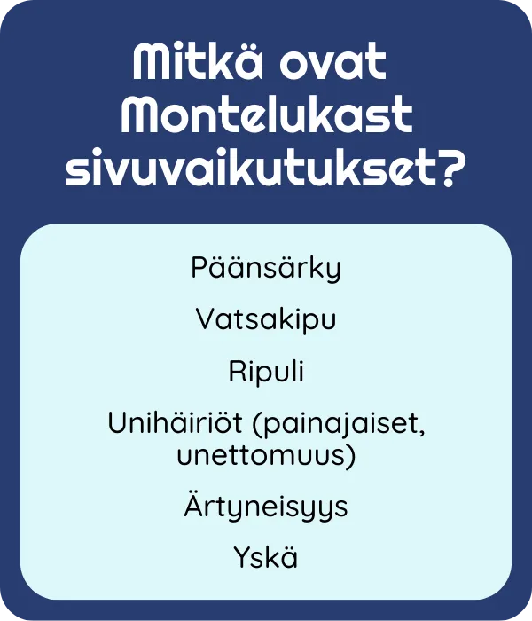 Oikein käytettynä montelukasti on yleensä hyvin siedetty ja turvallinen. Raskauden ja imetyksen aikana käyttö edellyttää yksilöllistä hyöty–riski -arviota ja lääkärin ohjeistusta. Noudata aina annostusta ja ohjeita. Älä muuta annosta tai lopeta hoitoa omin päin.