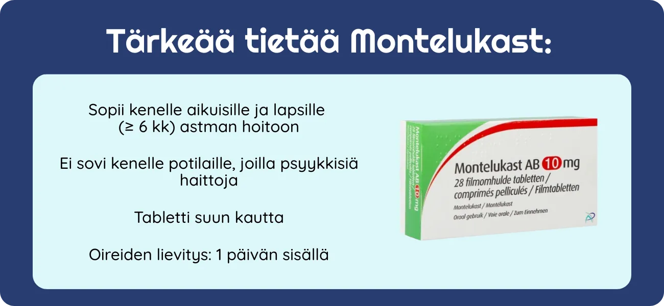Montelukasti on ylläpitohoito: sitä ei ole tarkoitettu akuutin kohtauksen ensiapuun, vaan oireiden ehkäisyyn ja pahenemisvaiheiden vähentämiseen osana kokonaisvaltaista hoitosuunnitelmaa.