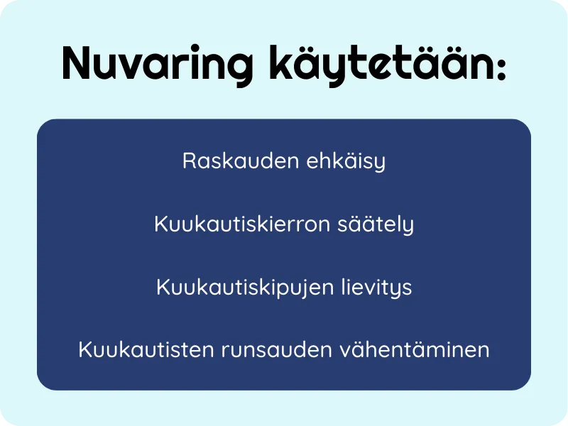 NuvaRing sopii hedelmällisessä iässä oleville naisille, jotka toivovat luotettavaa, vaivatonta ja helposti muistettavaa ehkäisyä sekä mahdollisuutta vaikuttaa kuukautisrytmiinsä. Rengas voi olla hyvä vaihtoehto, jos: