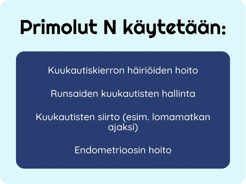 Primolut N on lääke, jota lääkärit määräävät naisille, joilla esiintyy epänormaalia emätinverenvuotoa, kuukautishäiriöitä tai vaihdevuosioireita. Jos kuukautisiin liittyy paljon kipua tai vuoto on poikkeuksellisen runsasta, Primolut N voi auttaa lievittämään oireita. Valmiste soveltuu myös kuukautisten siirtämiseen sekä endometrioosin (kohdun limakalvon kaltaisen kudoksen kasvu kohdun ulkopuolella) hoitoon osana lääkärin suunnittelemaa hoitoa.