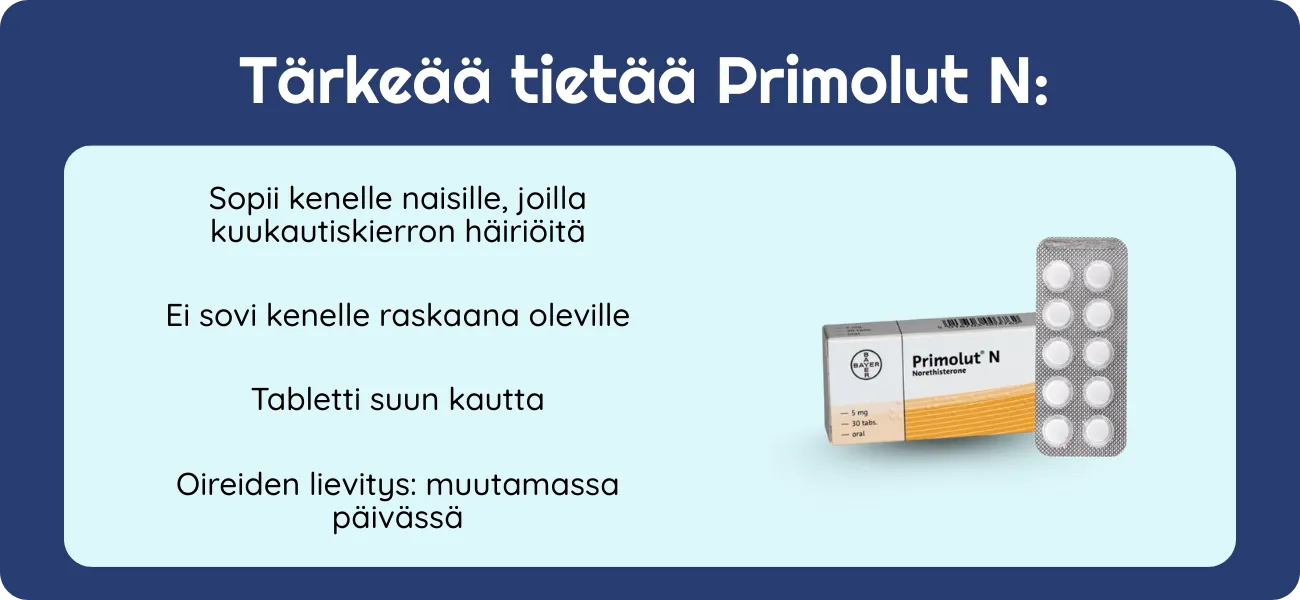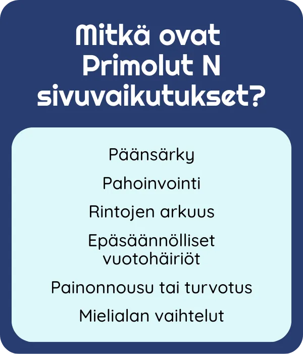 Jos epäilet valmisteen soveltuvan sinulle, keskustele lääkärin kanssa. Lääkäri arvioi yksilöllisesti, onko Primolut N oikea vaihtoehto oireidesi, perussairauksiesi ja käyttämiesi lääkkeiden perusteella.