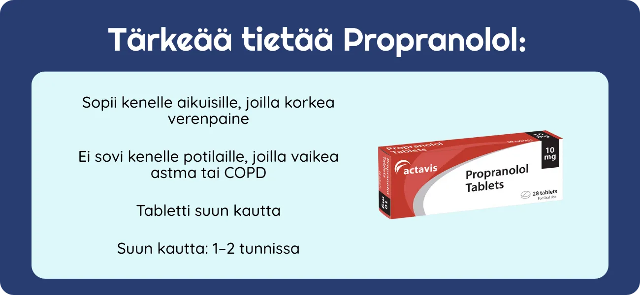 Lue aina pakkausseloste ennen käyttöä. Jos sinulla on kysyttävää propranololista tai sen sopivuudesta, kysy lääkäriltä tai apteekista. Hoitoa ei saa lopettaa äkillisesti; annoksen pienentäminen tehdään lääkärin ohjeen mukaan.
