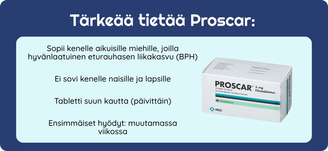 Lääkäri arvioi aina soveltuvuuden kokonaisterveytesi, mahdollisten liitännäissairauksien ja käyttämiesi lääkkeiden perusteella. Tarvittaessa hän voi yhdistää Proscarin alfa-salpaajaan (esim. tamsulosiini), mikä voi nopeuttaa oirehelpotusta alkuvaiheessa.