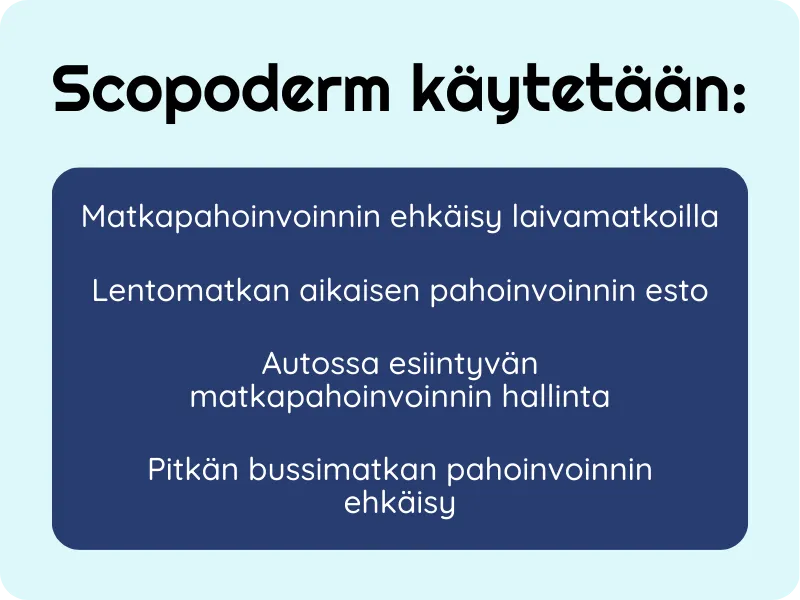 Lue aina pakkausseloste ennen käyttöä. Jos sinulla on kysyttävää Scopodermin käytöstä, yhteisvaikutuksista, matkasuunnitelmaasi sopivasta ajastuksesta tai haittavaikutuksista, käänny lääkärin tai farmaseutin puoleen. SuomiMeds tarjoaa yleisluonteista terveystietoa, joka ei korvaa terveydenhuollon ammattilaisen yksilöllistä arviota ja hoitoa.