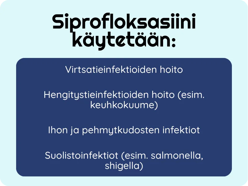 Siprofloksasiinia määrätään yleensä aikuisille, kun taustalla on lääkärin toteama bakteeri-infektio ja ensisijaisiksi suositellut vaihtoehdot eivät sovellu tai tehoa. Tyypillisiä käyttöaiheita ovat: