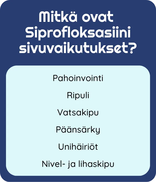 Siprofloksasiinilla on viranomaishyväksyntä, ja se on oikein käytettynä useimmille potilaille turvallinen. Kuten kaikki antibiootit, se voi kuitenkin aiheuttaa haittavaikutuksia. Noudata annostusta täsmällisesti, vältä turhaa auringon UV-altistusta (valoyliherkistymisriski) ja ota yhteyttä terveydenhuollon ammattilaiseen, jos sinulle ilmaantuu poikkeavia oireita.
