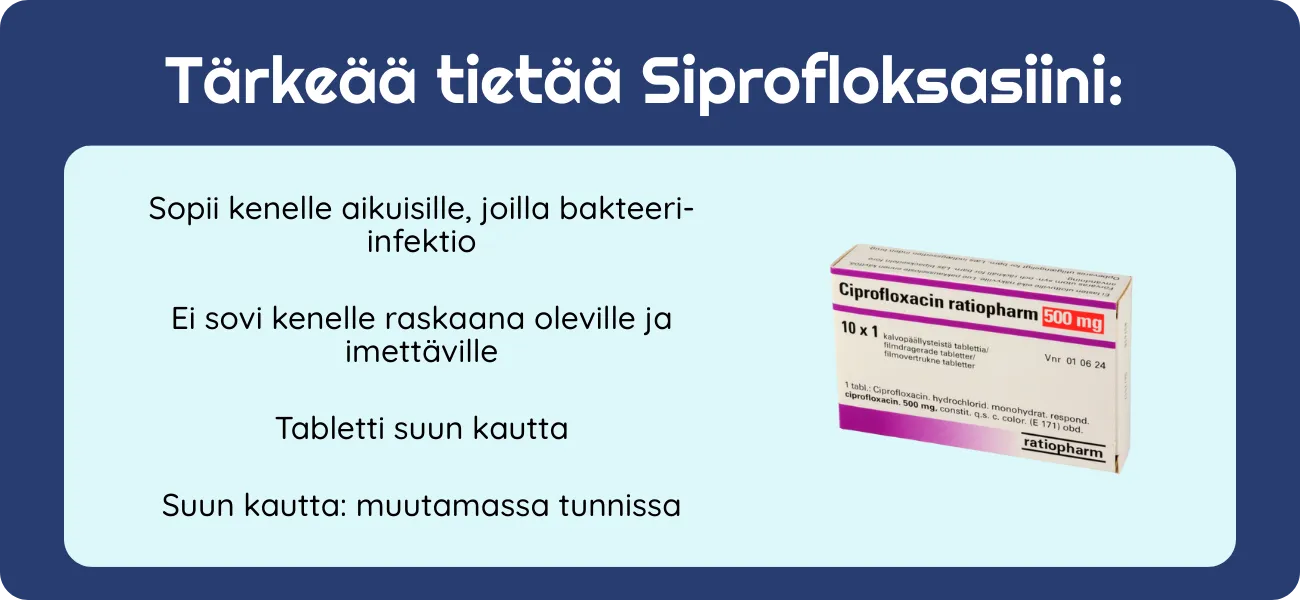 Lue aina pakkausseloste ennen käyttöä. Jos sinulla on kysyttävää siprofloksasiinista tai terveydestäsi, ota yhteyttä lääkäriin tai apteekkiin. SuomiMeds tarjoaa yleistä tietoa – se ei korvaa terveydenhuollon ammattilaisen yksilöllistä arviota.