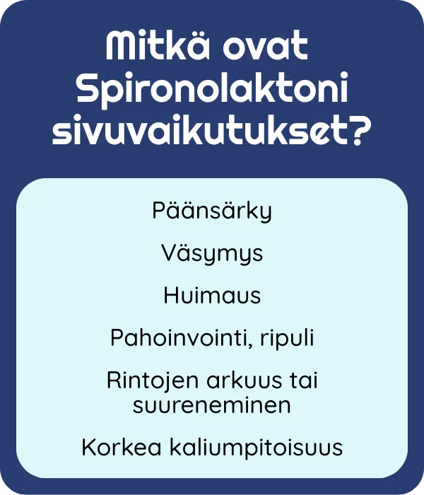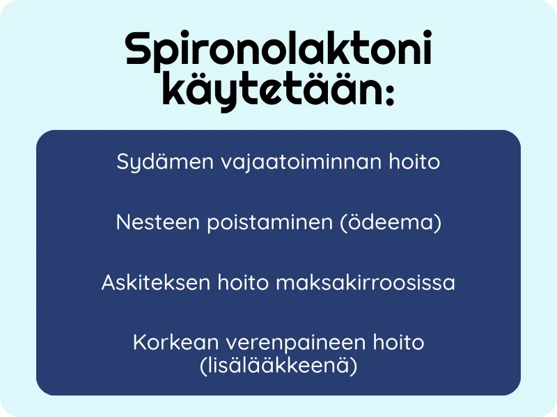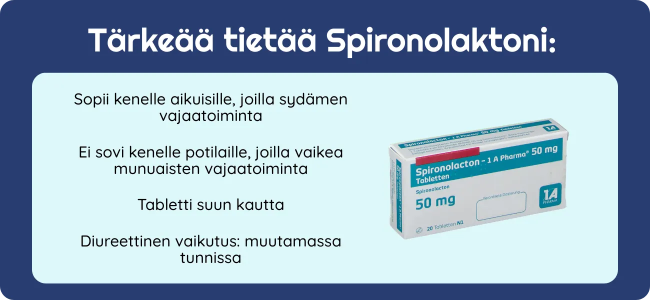 Lue aina pakkausseloste ennen käyttöä. Tämä sivu tarjoaa yleistä terveystietoa eikä korvaa lääkärin yksilöllistä arviota. Jos sinulla on kysyttävää spironolaktonin käytöstä tai sopivuudesta sinulle, ota yhteys lääkäriin.