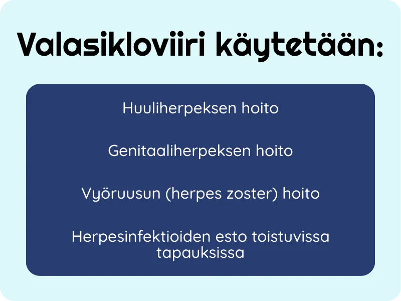 - Käyttöaiheet: huuliherpes (herpes labialis), genitaaliherpes sekä vyöruusu (herpes zoster).