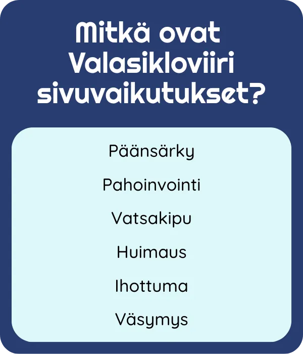 Valasikloviiri on laajasti käytetty ja viranomaisten (kuten EMA/FDA) hyväksymä, kun sitä käytetään ohjeen mukaan. Tyypilliset lievät haittavaikutukset ovat: