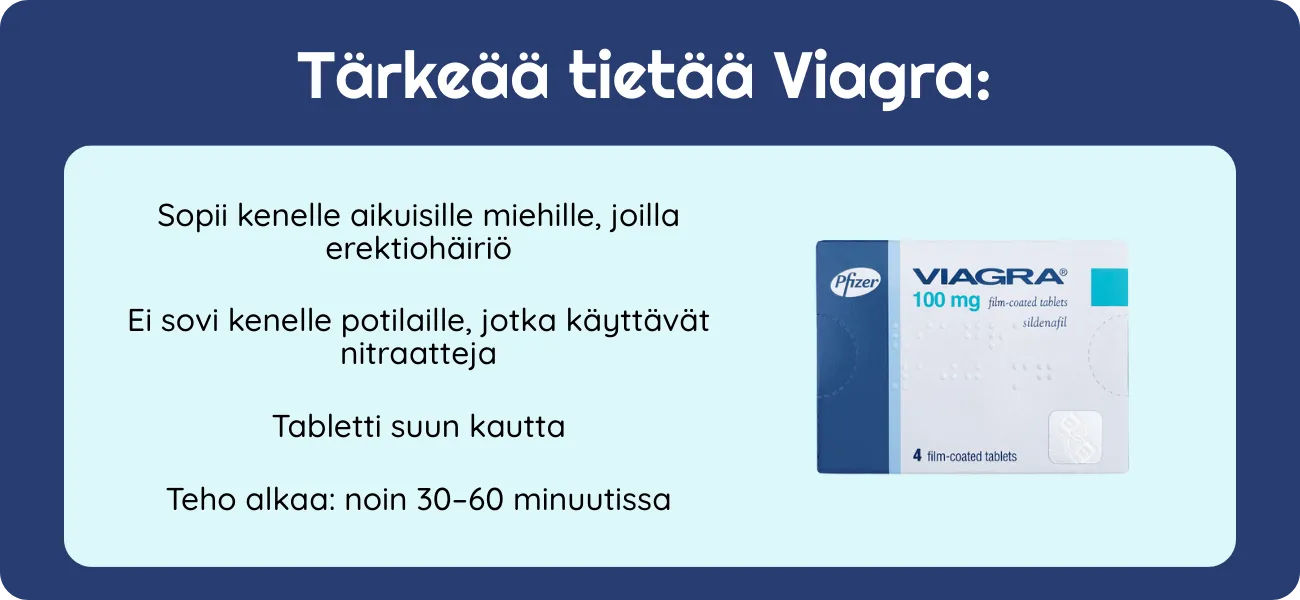 Viagra kuuluu PDE5‑estäjiin ja sisältää vaikuttavana aineena sildenafiilin. Se rentouttaa peniksen verisuonia ja lisää verenvirtausta seksuaalisen kiihottumisen aikana, jolloin erektio on mahdollinen ja sitä voidaan ylläpitää. Käyttöaihe: erektiohäiriö aikuisilla miehillä.