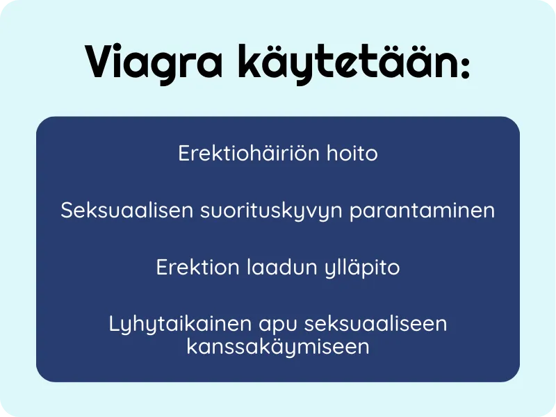 Viagra määrätään klinisesti todettuun erektiohäiriöön. Lääkäri arvioi erityisesti sydän‑ ja verenkiertoelimistön tilan, samanaikaiset lääkitykset ja vasta‑aiheet. (Sildenafiilia käytetään erikseen myös PAH‑hoidossa, mikä ei kuulu Viagran tavanomaiseen käyttöön.)