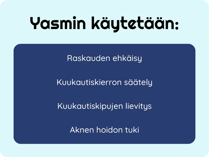 Yasmin on tarkoitettu hedelmällisessä iässä oleville naisille, jotka hakevat luotettavaa ja palautuvaa ehkäisymenetelmää. Se sopii henkilöille, joilla ei ole hormonaalisen ehkäisyn käytön vasta-aiheita. Käytön aloittaminen tulee tehdä terveydenhuollon ammattilaisen kanssa, erityisesti jos sinulla on kohonnut riski veritulppiin, sydän- ja verisuonisairauksiin tai jos lähisuvussa on hormoniherkkää syöpää.